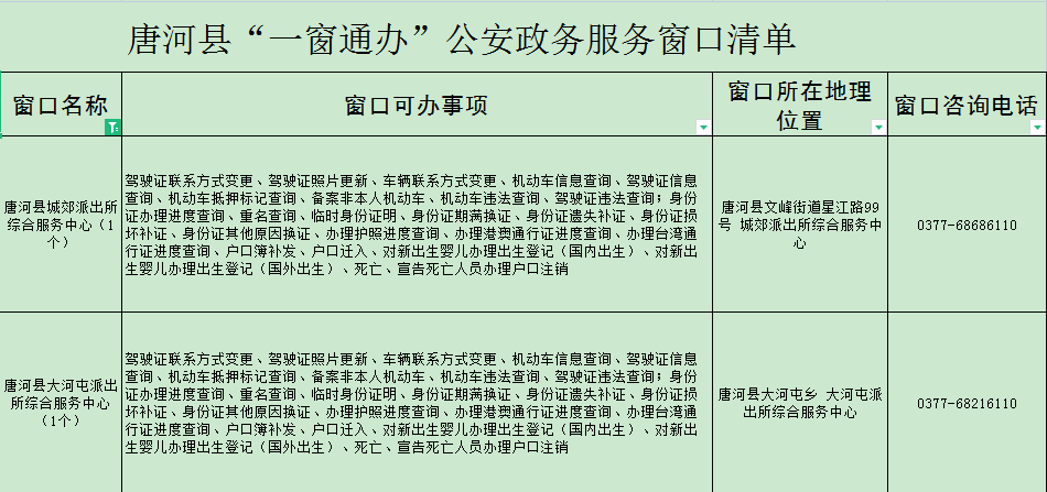 唐河县“一窗通办”公安政务服务窗口及可办事项清单