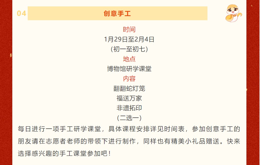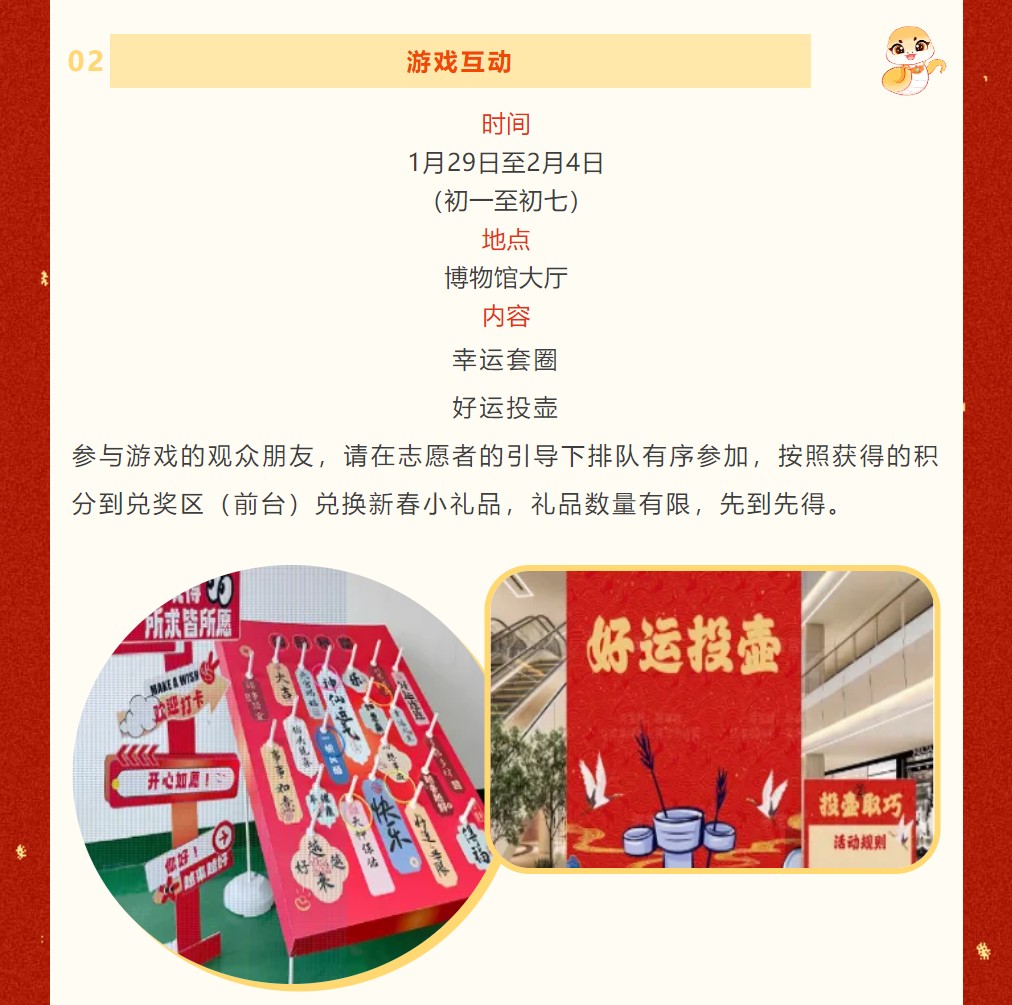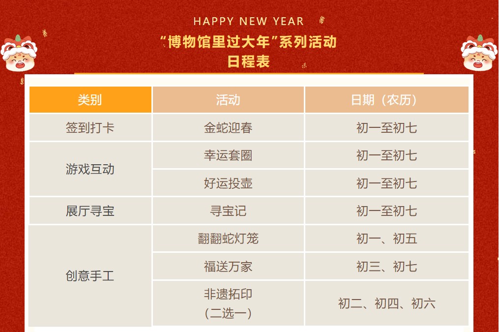 “博物馆里过大年”春节系列活动时间为1月29日至2月4日(初一至初七)上午9:00至12:00,下午2:00至4:40。
